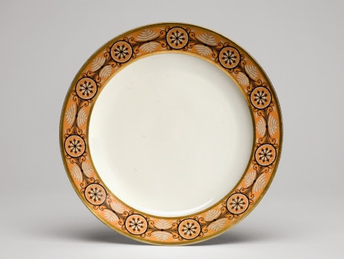 Artists of the miscellaneous arts were naturally receptive to the neoclassical style because of the abundant number of decorative motifs available from classical antiquity. This dinner plate bears a popular group of motifs on Nast wares, the shield-like medallion between scrollwork and stylized palm fronds (“palmette”). Such motifs occur on ancient Greek vase paintings from the earliest times, as well as been visible as reliefs on Roman architecture. The restrained use of decoration in contrast with the simple white plate is typical of Neoclassicism.