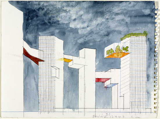 | Stephen Holl, Design for Linked Hybrid, Beijing, 2003, completed 2009, watercolor and pencil on paper, 22.9 x 30.5 cm The Museum of Modern Art, New York, © 2025 Stephen Holl (MOMA-P4384) |