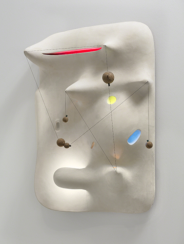 | Isamu Noguchi (1904–1988, United States), Lunar Landscape, 1943–1944. Magnesite, cement, cork, fishing line, electric lights and acetate on wooden mount, 34 7/16" x 24 ¾" x 7 7/8" (87.5 x 62.8 x 20 cm). Hirshhorn Museum and Sculpture Garden, Smithsonian Institution. © 2019 Estate of Isamu Noguchi/Artists Rights Society (ARS), New York. (SI-258ngars) |