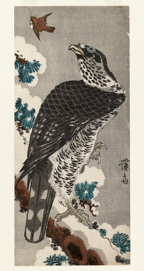 | Keisai Eisen, Hawk on a Snowy Branch Eyeing a Sparrow, 1830, color woodcut print on paper, 33.7 x 15.2 cm (13 1/4" x 6”) Image © 2026 Brooklyn Museum (BMA-2612) |