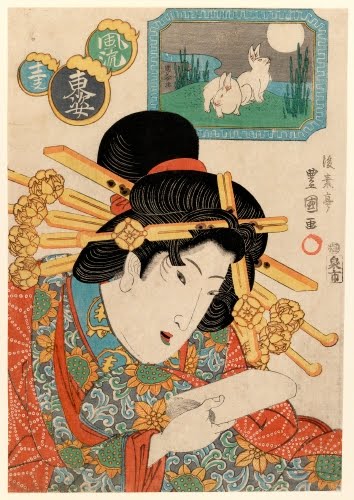 During the Edo Period (1615–1868) in Japan, the Ukiyo-e prints chronicled the latest fashions as worn by famous beauties in the entertainment districts of Japanese cities such as Tokyo (Edo) and Osaka. What started in the 1700s as understated elegance in hairpins shown in the work of artists such as Suzuki Harunobu (1725–1770) and Kitagawa Utamaro (1753–1806), by the late Edo period became gaudy and overdone. Note the stunning poise of Gosotei’s model with the weighty hairpins. I especially appreciate the “X” framing her face with the delicately penciled in eyebrow situation. Gosotei was the most prolific and most copied artist of actor and beauty prints from Osaka.