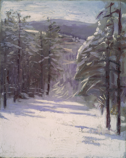 “Winter white” can conjure up a number of associations for people: a color of clothing worn in winter, a color of house paint, etc. For art historians like me, the mind goes right to fabulous landscapes documenting the many nuances of white in winter scenes. Boston native Abbott Handerson Thayer was part of the Boston painting scene when it transitioned from Tonalism to Impressionism between the late 1800s and early 1900s. He produced many brilliant snow scenes, but I find this one – probably in the region of Mount Monadnock near Dublin, NH -- particularly lovely, so I need to share it with you.