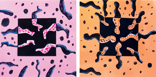 Each student was given a 12 x 12" (30 x 30 cm) sheet of colored paper and a 5 x 5" (12.5 x 12.5 cm) sheet of either black or white paper. I asked them to draw a minimum of one tentacle shape, starting on each edge of the smaller sheet of paper. I modeled using two stretched out “S” lines to create the shape; students can create their own version with zigzags or blocky lines. Students cut out their shapes, centered the smaller square on the larger, and flipped the cut pieces outward to occupy the negative space of the larger square. They used an additional sheet of paper to add more tentacle shapes to that negative space. Once students were happy with their compositions, they glued the pieces in place.