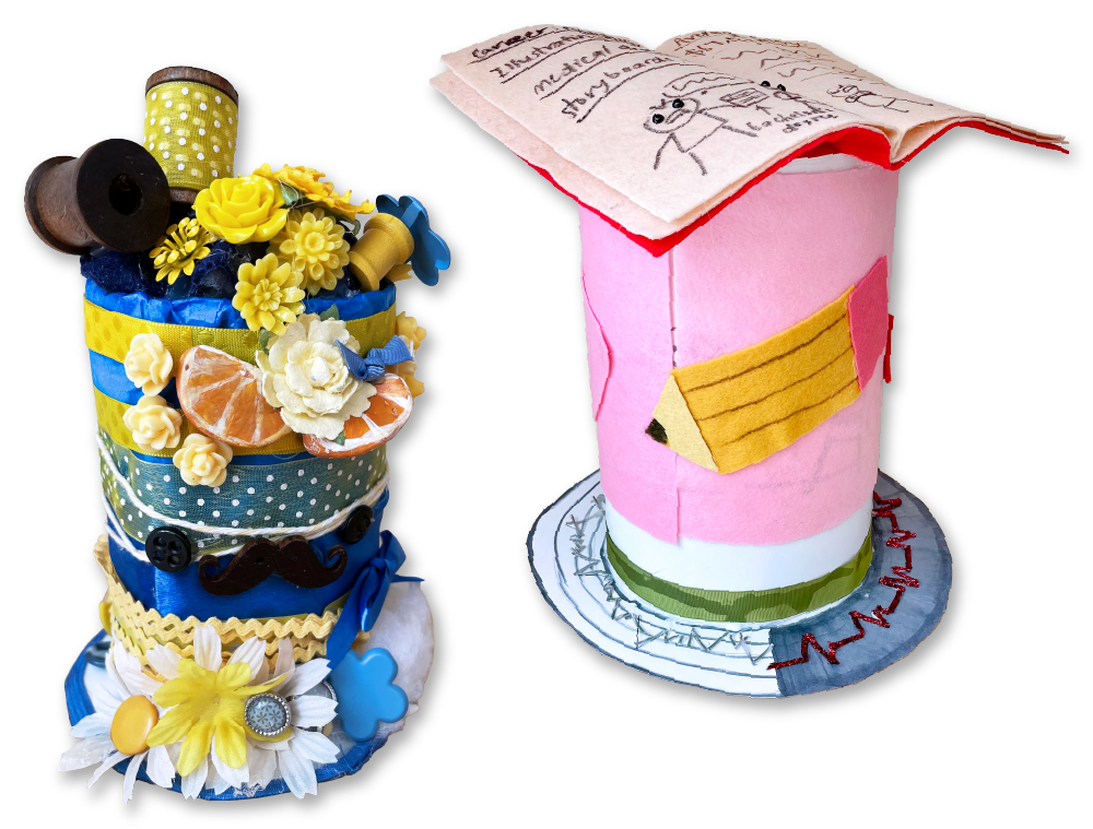 Students were asked to create the template first, and to complete all the parts before assembling their hat. In their design, they were asked to include symbols and imagery that represented their chosen career.