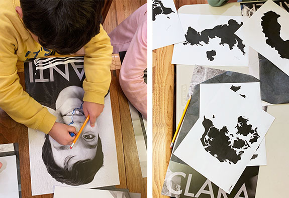 Left: Hayden, portrait of ancestral lands Sweden and England. Right: Santi, portrait with ancestral lands Sweden and Mexico.Left: Santi, grade two, uses an oil pastel to trace his drawing of Sweden. Right: Clara, grade two, will use these printouts to trace her countries of origin over her photograph.